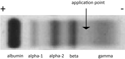 Proteins flow based off of surface charge, and all of the serum proteins have a net negative surface charge. Here is a typical normal pattern which shows all five groups as well as the application point of the sample.