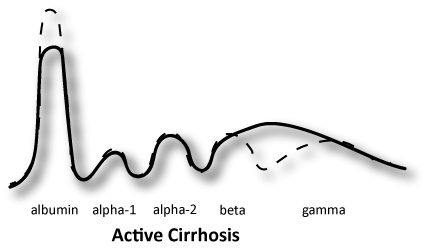 In active cirrhosis, the pattern will have a decrease in albumin and an increase in the beta and gamma regions dubbed beta-gamma bridging. The decreased albumin is due to decreased synthesis. Albumin is synthesized in the liver. The increase in the beta-gamma region is due to decreased clearance of IgA antibodies which migrate in the beta and gamma regions. Increased IgA is related to the liver cirrhosis.