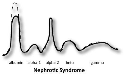 In nephrotic syndrome, the pattern will have a decrease in albumin and an increase in the alpha-2 region. The decreased albumin is due to increased permeability in the glomerular membrane of the kidney. The increased permeability causes an increase in protein lost in the urine. The increase in the alpha-2 region is due to the size of the protein α₂-macrogloblin (A2MG). Even with the increased permeability of the kidneys, it’s too big. In addition, the liver will increase protein synthesis of A2MG and A2MG can fill in for albumin in regards to oncotic pressure.