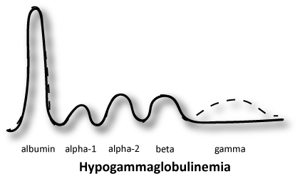 In hypogammaglobulinemia, the pattern will have a really low gamma globulin region. Anything that causes a decrease in the gamma globulins (IgG, IgA, IgM) like an immune deficiency can cause hypogammaglobulinemia.