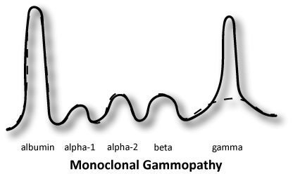 In a monoclonal gammopathy, the pattern will have a large spike in the gamma region. An immunoglobulin (IgG, IgM, IgA) from a single B-cell clone is produced in excess. These are mostly caused by hematological disorders including: multiple myeloma, lymphoma, CLL, Waldenstroms macroglobulinemia, heavy chain disease, and MGUS.